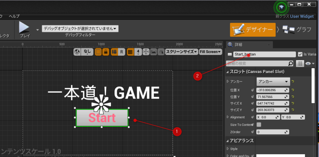 UiWg_StartGameのデザイナーから以前作ったボタンを選択①して名前を「Start_button」に②する