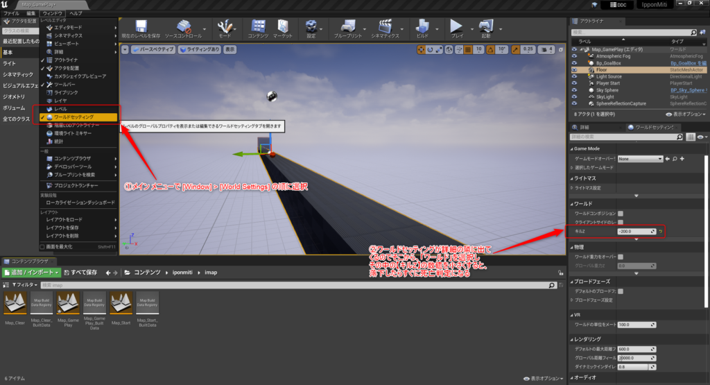 ①メイン メニューで [Window] > [World Settings] の順に選択