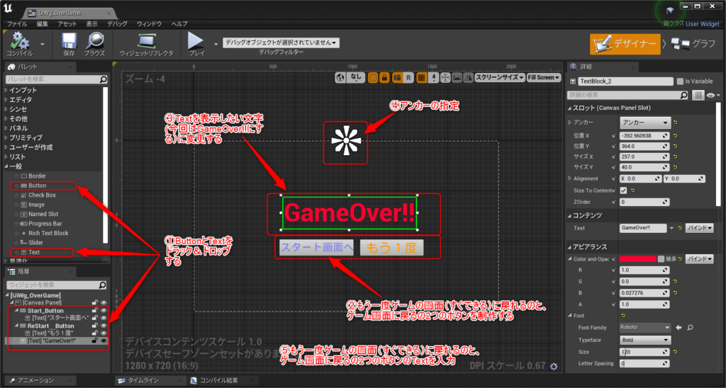 ③Textを表示したい文字(今回はGameOver!!にする)に変更する