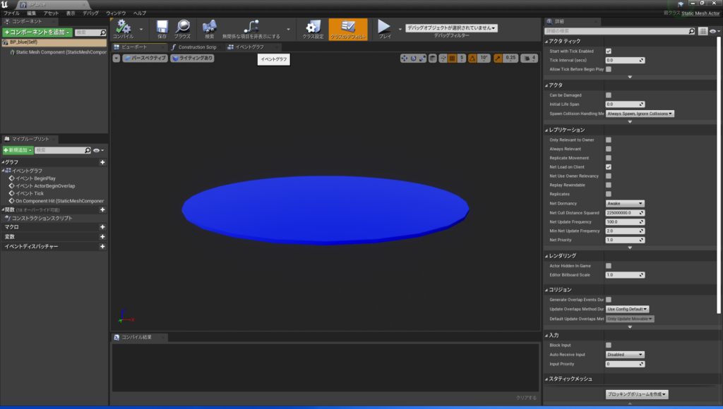 ・左上のにある「Static Mesh Component」を押し、右側を下にスクロールしたところにある「On Component Hit」のプラスを押す(これは「このBPに何かが触れたら」というイベントノードです)